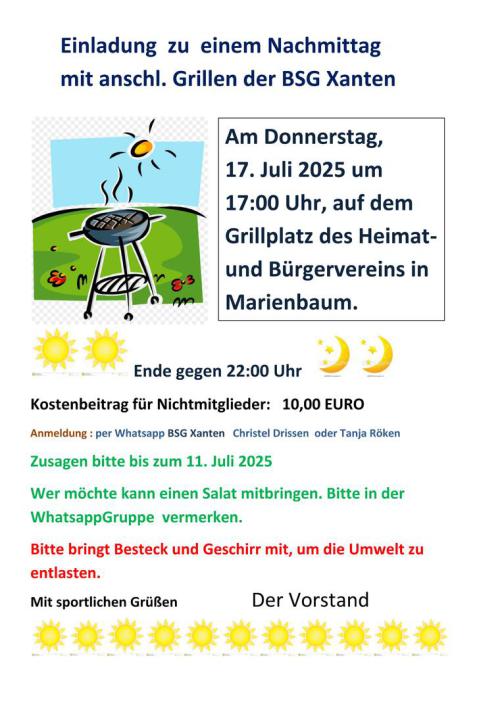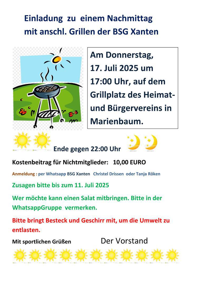 Am Donnerstag, dem 17. Juli 2025, trafen sich die Vereinsmitglieder, Angehörige und Freunde der BSG Xanten zum traditionellen Grillfest in der Marienbaumer Grillhütte.